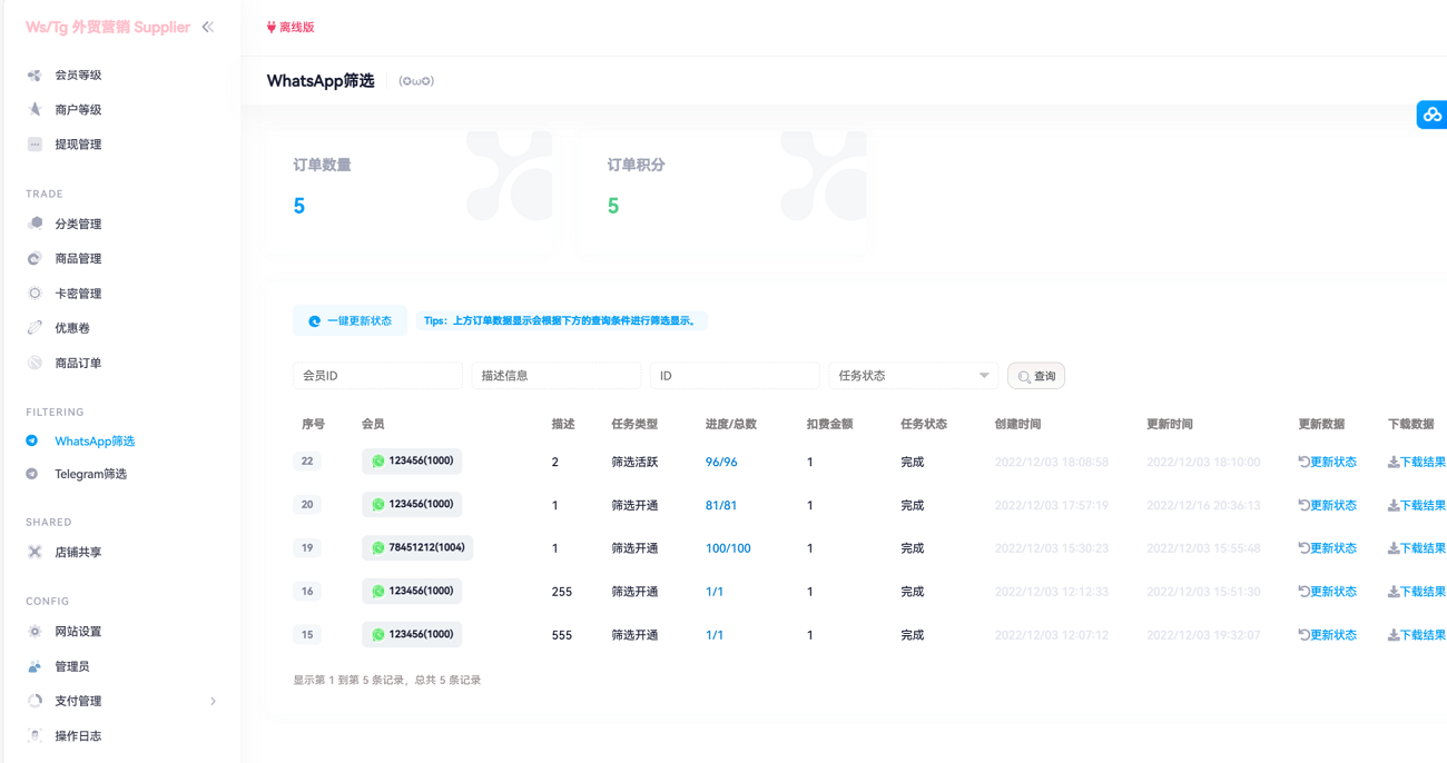 海外社交软件买卖,以前都是通过联系购买,现在拥有这样的销售系统可以躺着把钱赚,只需要把网站推广出去就能做到自助购买,非常便利。