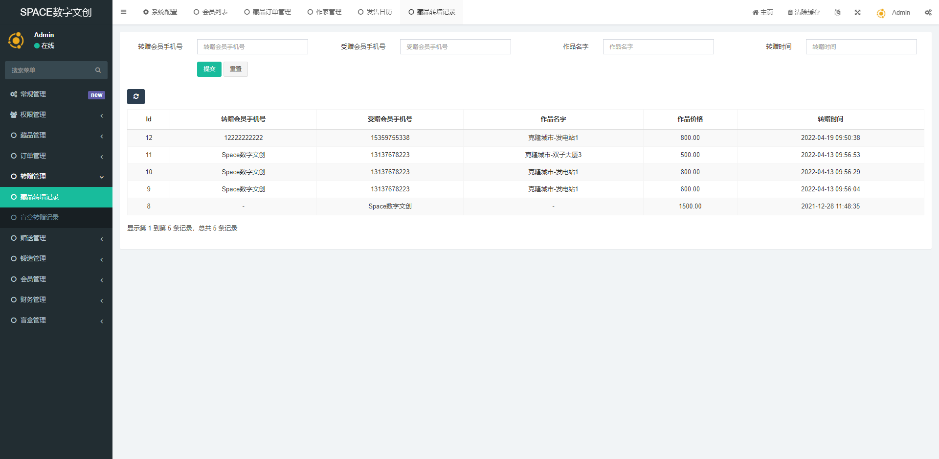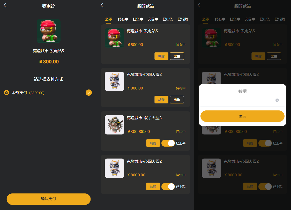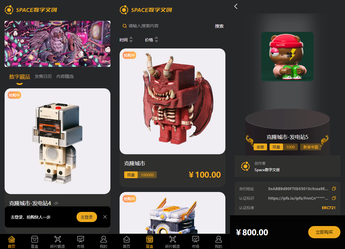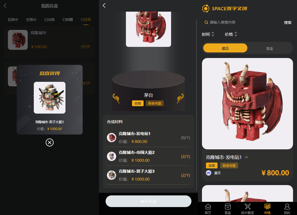 数字藏品、盲盒、碎片锻造、转增、盲盒转增、盲盒出售、有市场(出售盲盒,或者自己的数字藏品都会在这里显示)、邀请功能、团队下级等